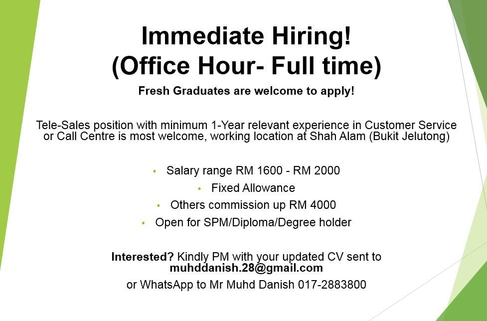Muhd Danish On Twitter Immediate Hiring Tele Sales Representative Office Hour Full Time Fresh Graduates Are Welcome To Apply Interested Kindly Private Message With Your Details Maukerja Kerjakosong Vacancy Lowyat Jobmalaysia Shahalam
