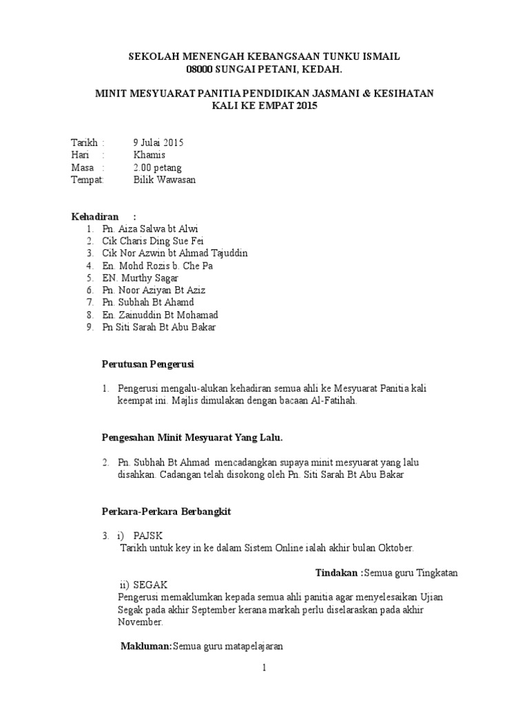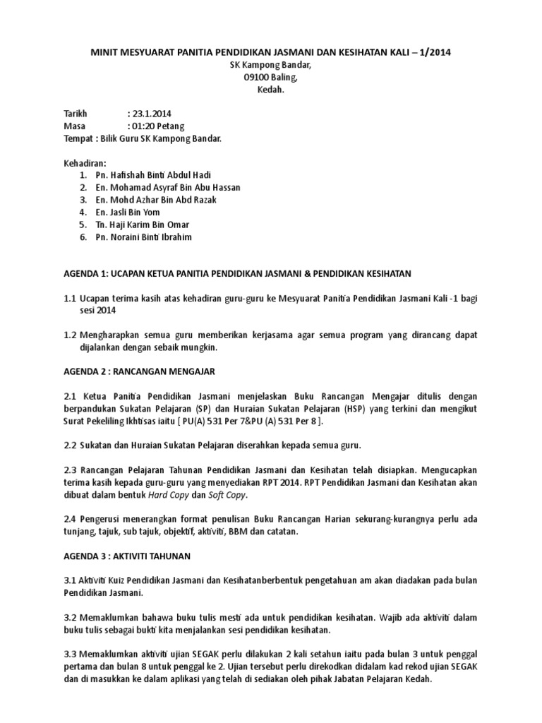 Doc Contoh Minit Mesyuarat Panitia Pendidikan Jasmani Kali Izzat Idris Academia Edu