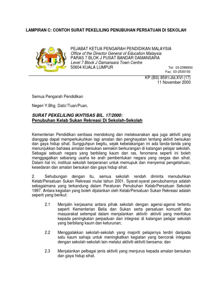 Surat Pekeliling Ikhtisas Bil 20 2000 Panduan Penubuhan Persatuan Sekolah 1998 Seksyen 130 Pdf Document